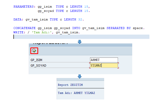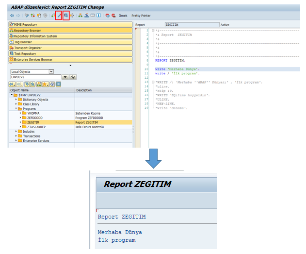Sırasıyla “etkinleştir” ve “çalıştır” butonlarına tıkladığımızda ABAP ve ekran görüntüsü aşağıda belirtildiği gibi görüntülenecektir.