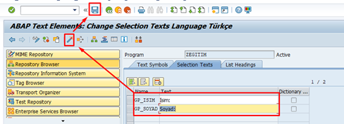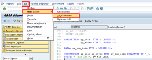 ABAP editöründe bir program “okunabilir modda” (display mode) olduğunda, üzerinde herhangi bir değişiklik yapılamaz. Bu durumda ekran gri renktedir ve klavye ile değişiklik yapılamaz. Programı veya nesneyi “yazılabilir modda” (change mode) düzenlemek için gözlük ve kalem butonuna tıklamalıyız.