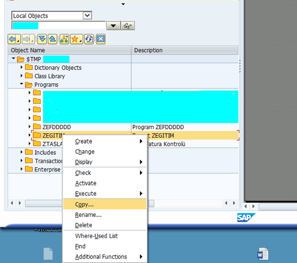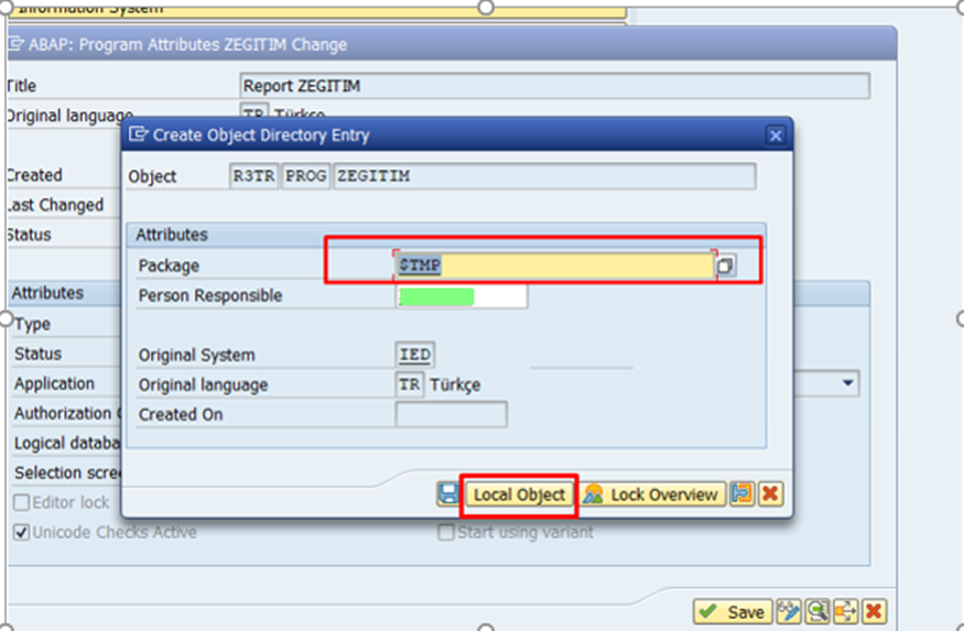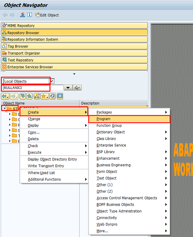 SE80 ekranında local objects ve kullanıcı adı girilerek “enter” tuşuna basılır. $TMP sekmesine sağ tıklayın ve Create > Program seçeneğini seçin.