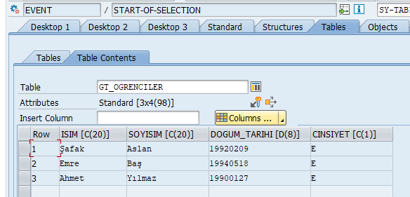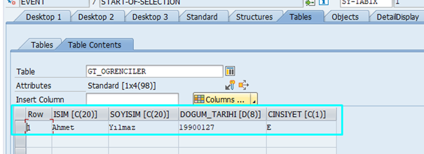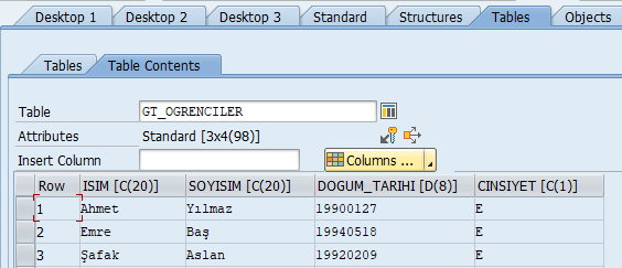 Artık gt_ogrenciler tablosu, Data Dictionary’de tanımladığımız yapıya dayalı olarak çalışıyor. Her defasında alanları tek tek tanımlamamız gerekmiyor.