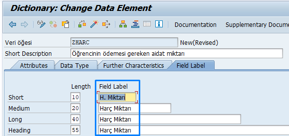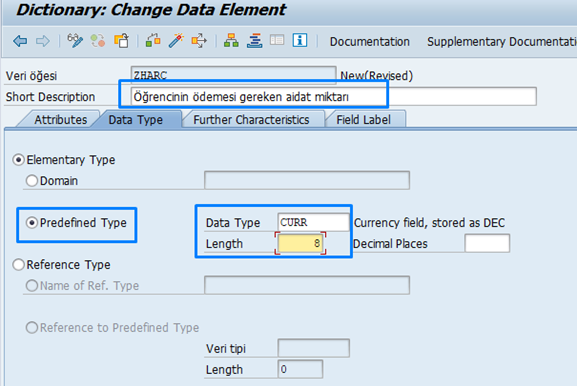 Aktifleştirdikten sonra, ZHARC alanını tanımlarken Reference field bölümüne ZPARABIRIMI alanını gösteriyoruz. Böylece sistem, harç miktarının hangi para biriminde olduğunu bilecek.